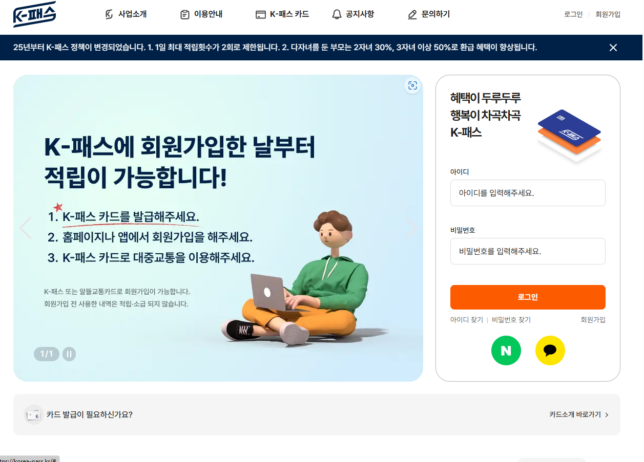 - K-패스 공식 홈페이지 또는 모바일 앱 접속